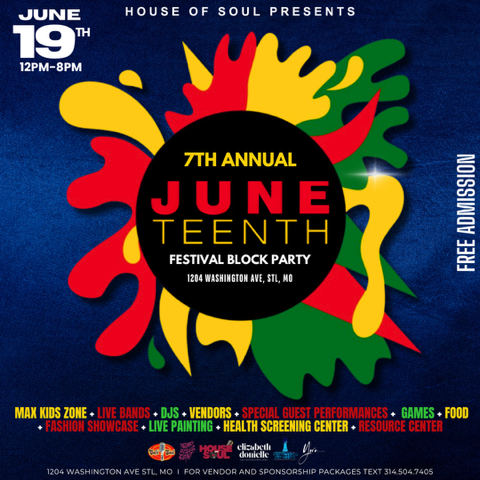 Mark Your Calendars! Join the fun at the 7th St.Louis Official Juneteenth Festival Block Party on June 19th from 12 pm-8pm at 12th & Washington avenue! A Real Block Party! It’s FREE to attend & family friendly. Text 314.504.7405 for more information.